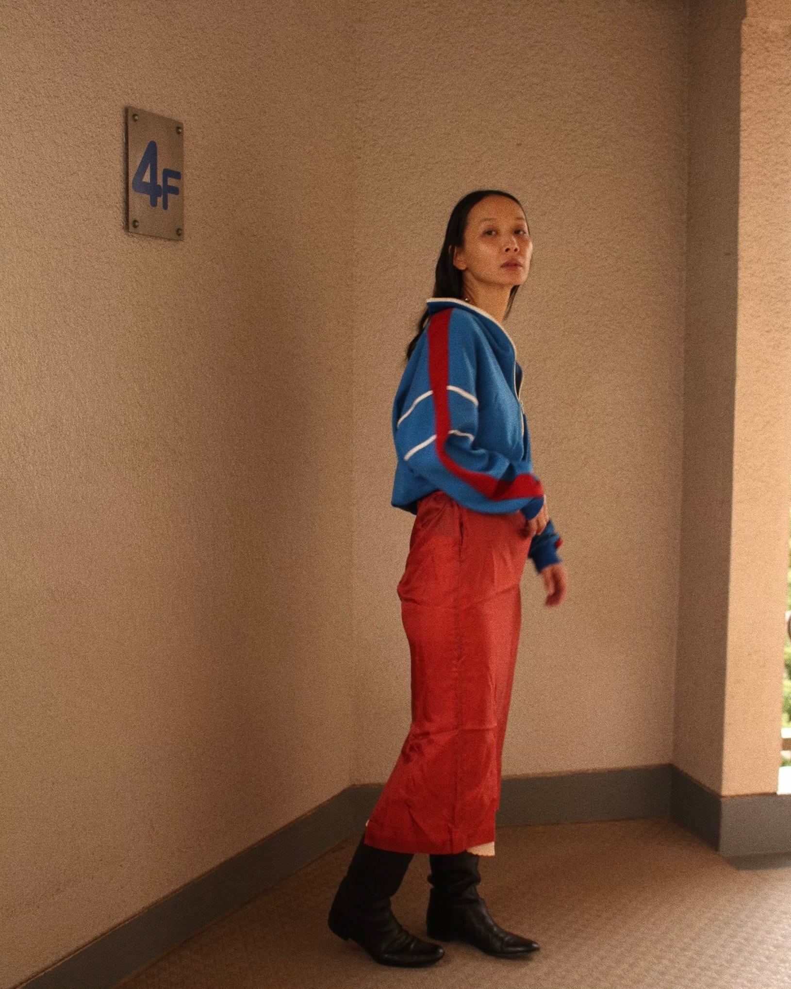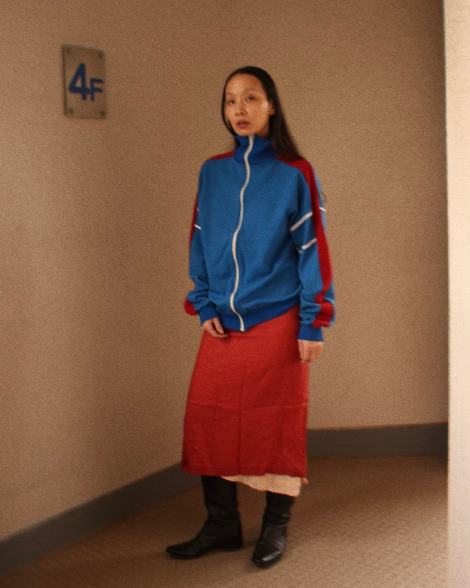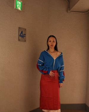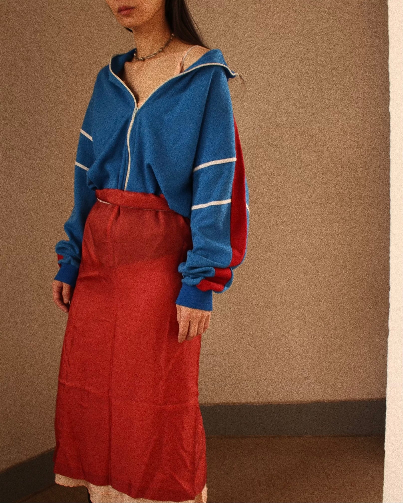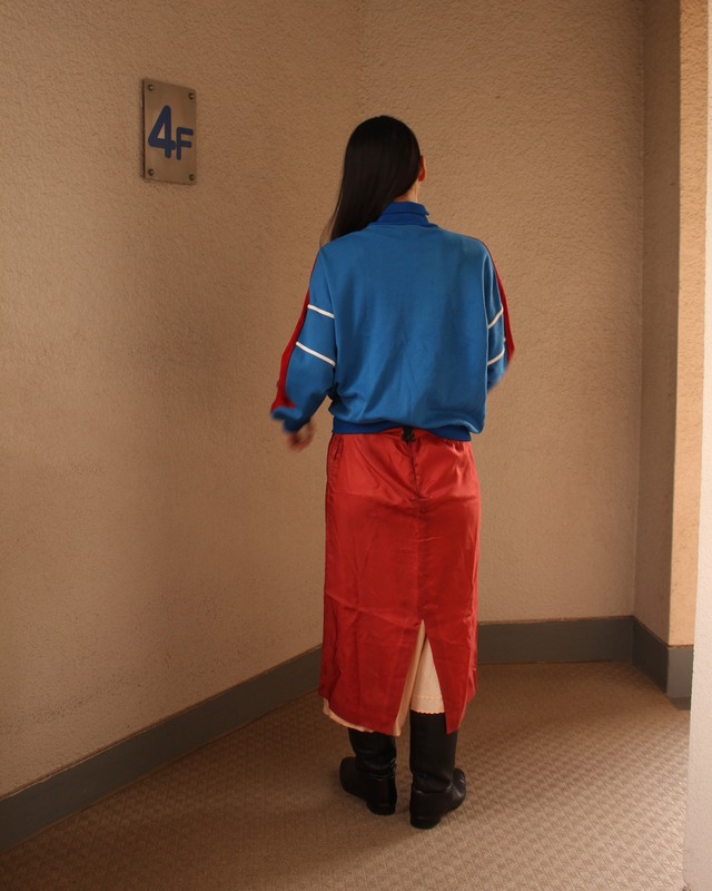 首元と袖口のリブの生地感が良く、配色のボルドーに近い赤とブルーが良いコンビネーションのカラーリングになっている1枚です。