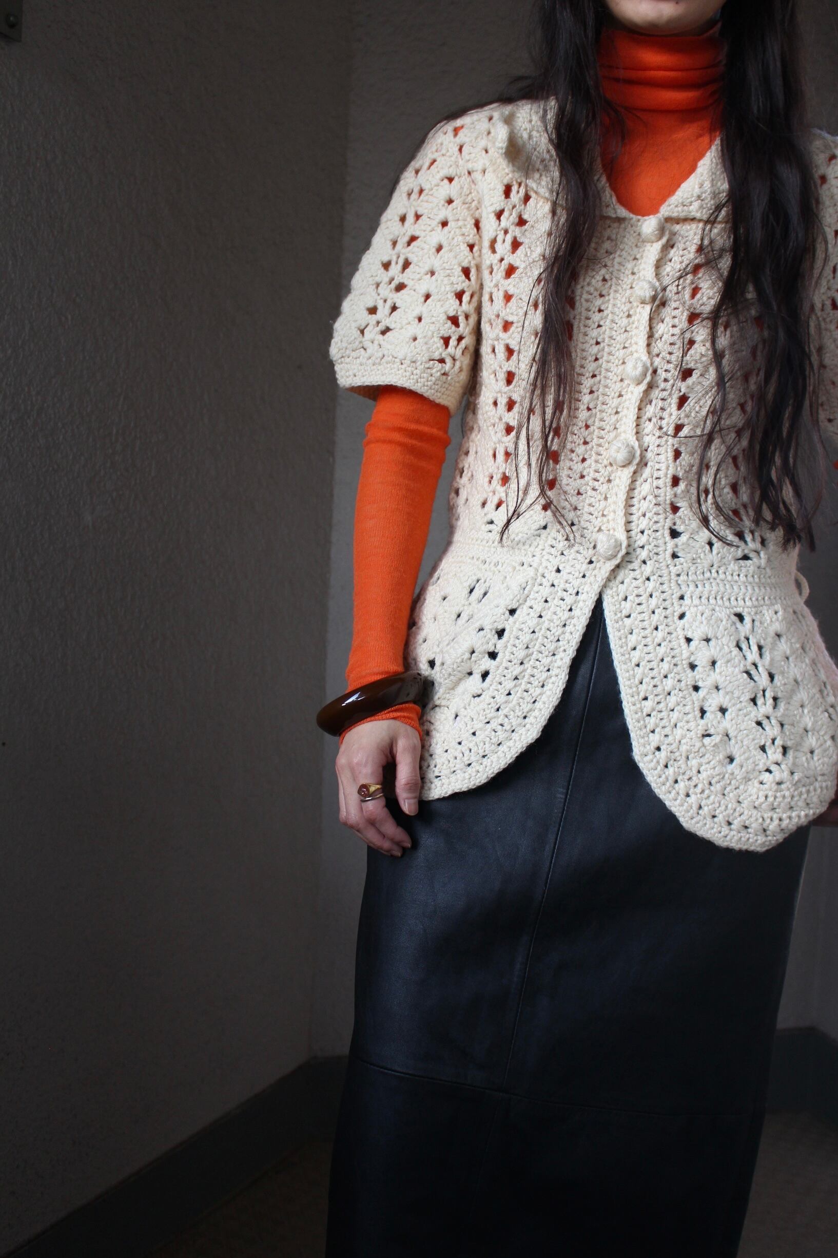 60年代 クロシェ編みのハンドメイドニットになります。 肩幅 36㎝ 袖丈 25㎝ 身幅 43㎝ 着丈 58㎝ 年代物になります為多少の使用感がございますが 大きなダメージはございません。